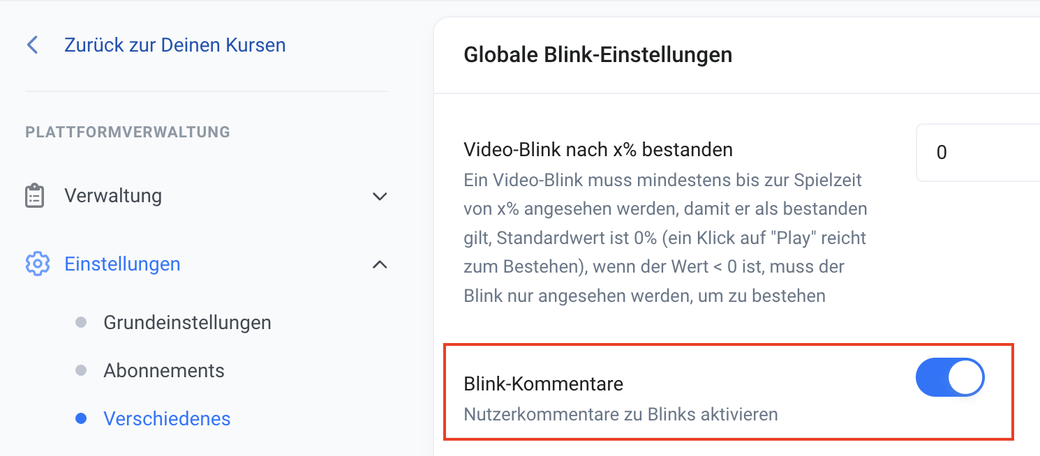 Damit Kommentare unter Blinks in Kursen erlaubt werden können, muss die Funktion plattformweit aktiv sein. Rufe dafür die Plattformverwaltung per Klick auf "Plattform verwalten" auf. Unter "Einstellungen" → "Verschiedenes" → "Globale Blink-Einstellungen" findest du die Option "Blink-Kommentare". Damit lässt sich die Kommentarfunktion plattformweit aktivieren / deaktivieren: