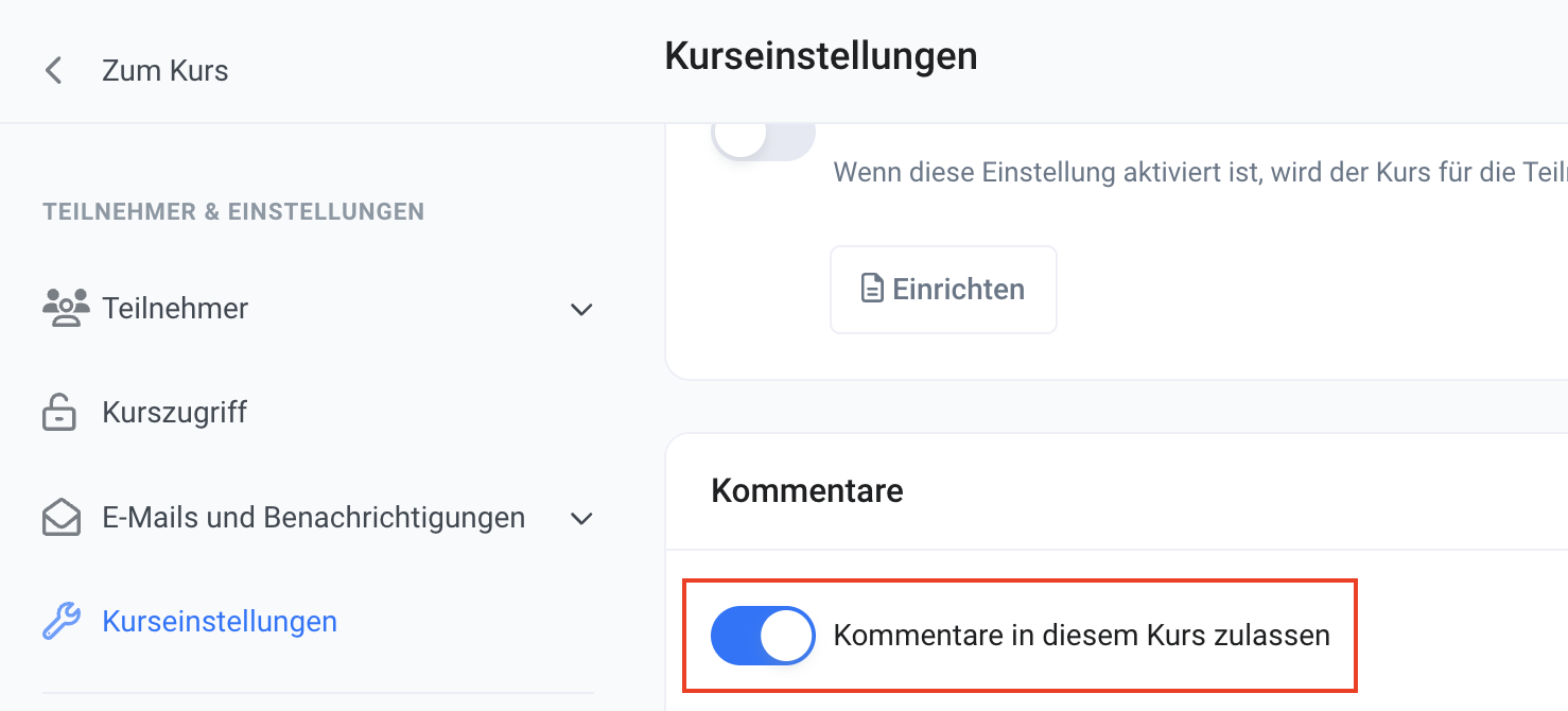 In den Kurseinstellungen von jedem Kurs lässt sich die Kommentarfunktion pro Kurs aktivieren / deaktivieren. Klicke im Kurs auf "Teilnehmer & Einstellungen" → "Kurseinstellungen". Im Abschnitt "Kommentare" findest du die Einstellung "Kommentare in diesem Kurs zulassen":