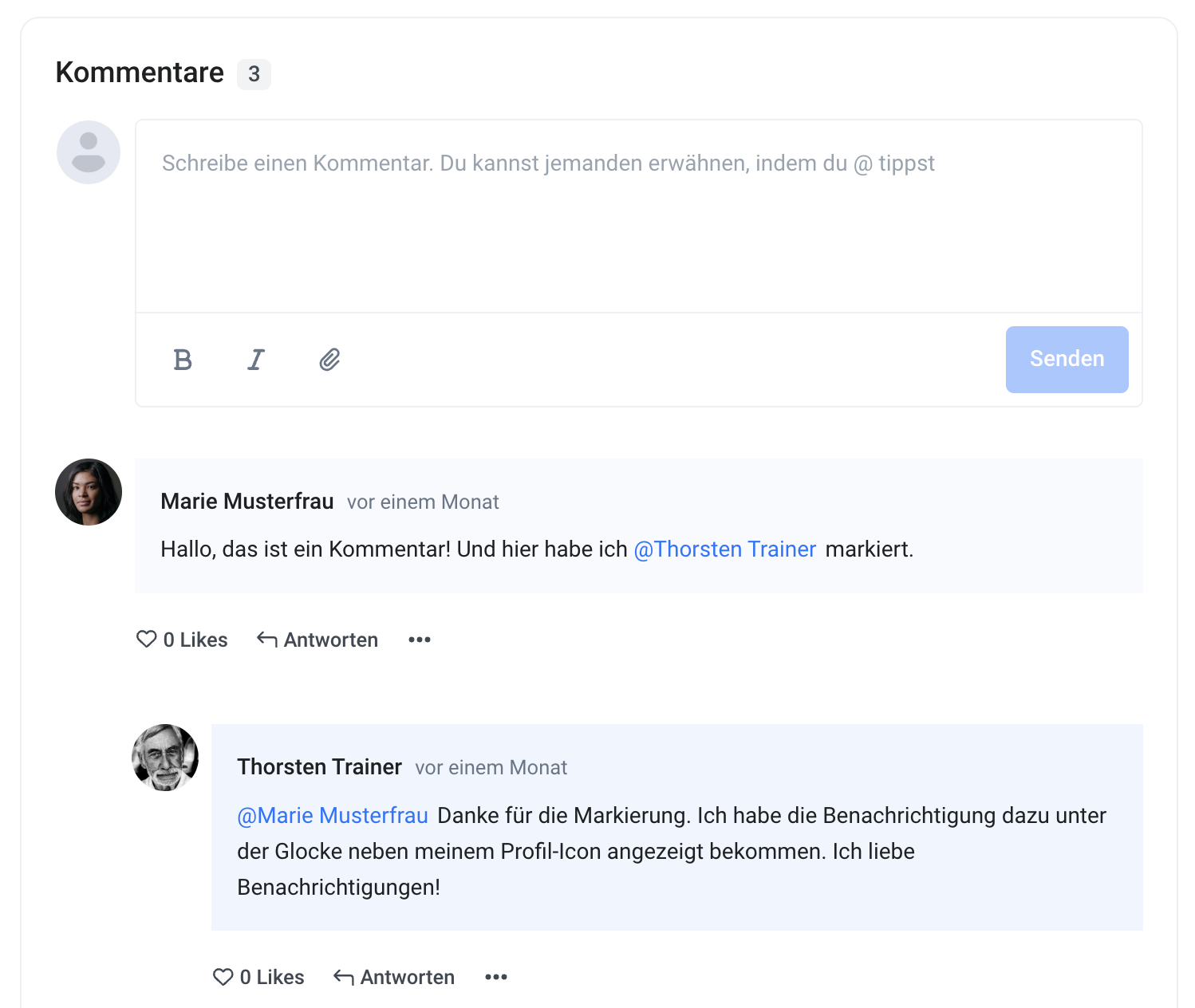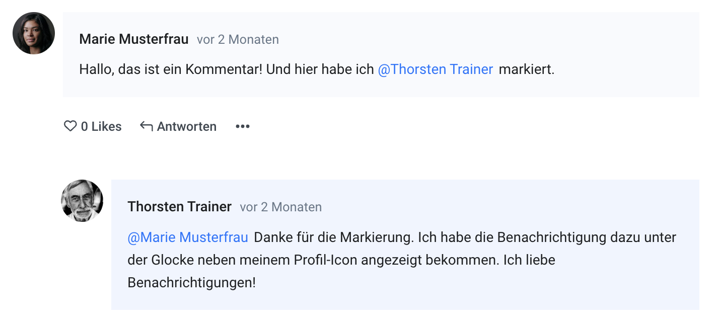 Erwähnungen in Kommentaren sind durch die farbige Hinterlegung und @-Markierung des Namens erkennbar. Teilnehmer erhalten über ihren News-Feed (Glocke neben dem Profil-Icon) eine Benachrichtigung, wenn sie in einem Kommentar markiert wurden.