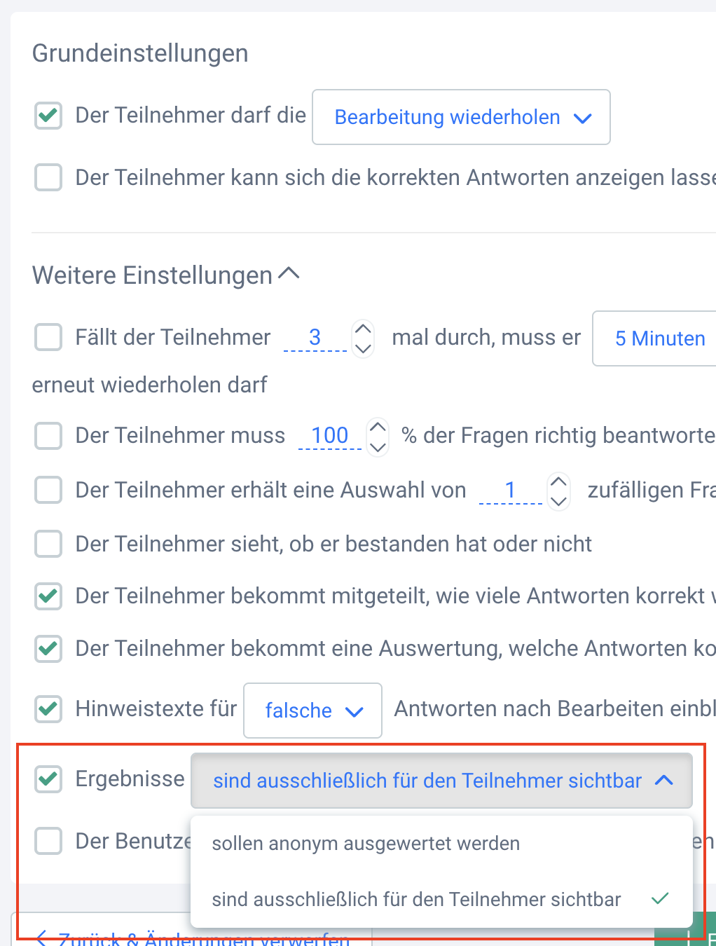 "Ergebnisse sind ausschließlich für den Teilnehmer sichtbar" - Interaktionseinstellung