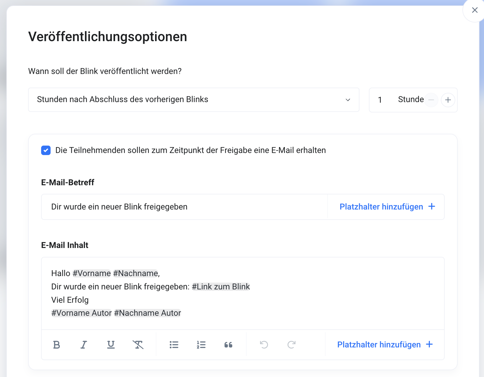 Du hast hier außerdem die Möglichkeit, eine Benachrichtigung einzurichten. Diese wird zum Zeitpunkt der Freigabe des Blinks an die Teilnehmer versendet.
