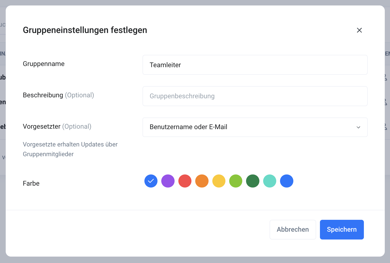 Trage nun den Gruppenname ein, füge (optional) eine Beschreibung und Vorgesetzte hinzu und wähle die Farbe der Gruppe aus:
