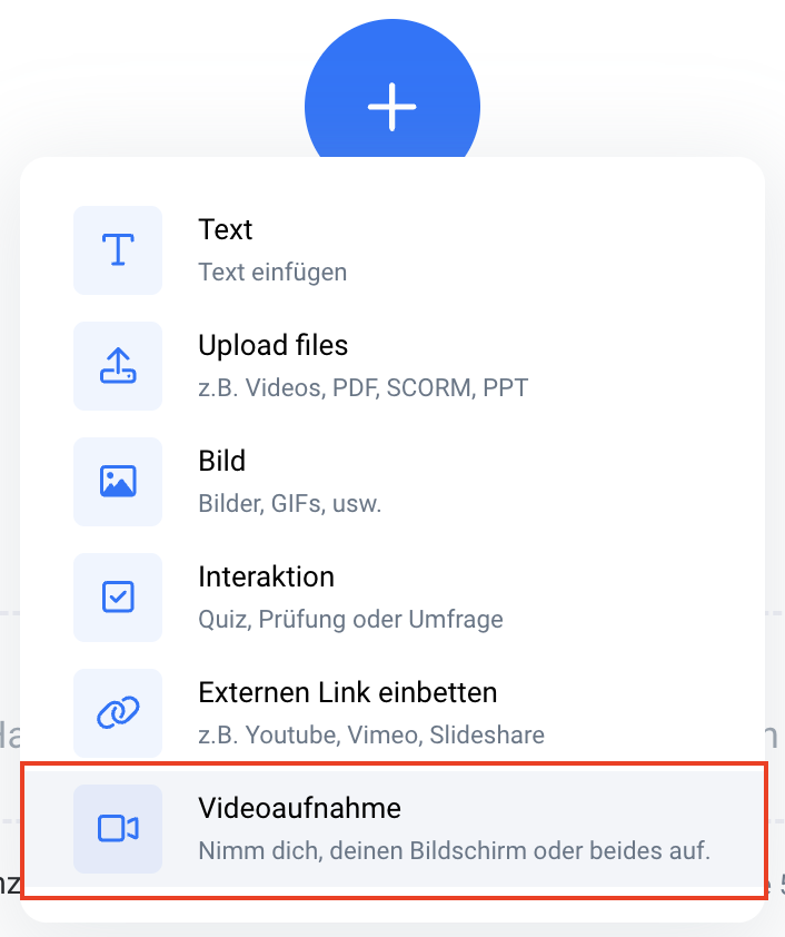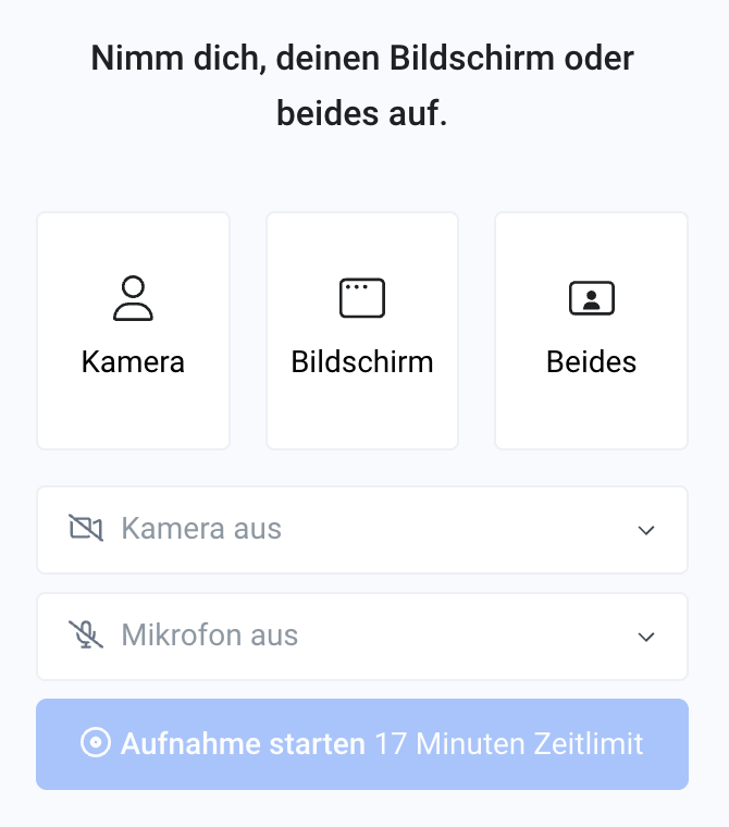Neben der Möglichkeit, fertige Videos hochzuladen oder einzubetten, kannst du mit unseren integrierten Video-Recorder auch direkt im Blink ein Video aufnehmen. Dabei kannst du dich selbst, deinen Bildschirm, oder beides gleichzeitig aufnehmen.