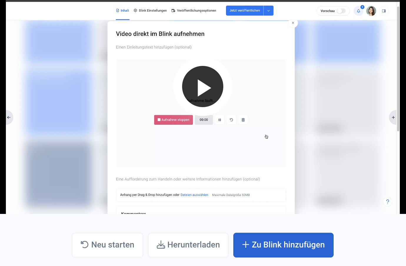 Wenn du mit der Aufnahme fertig bist, klicke auf "Aufnahme stoppen". Du kannst dein Video nun überprüfen und wenn damit alles passt, kannst du es optional herunterladen, oder per Klick auf den Button "+ zu Blink hinzufügen" speichern und in deinen Blink einbetten.