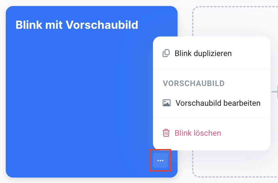 Du kannst für Blinks eigene Vorschaubilder hochladen. Klicke dafür auf der Blink-Kachel auf das Drei-Punkte-Menü und dann unter "Vorschaubild" auf "Vorschaubild bearbeiten":