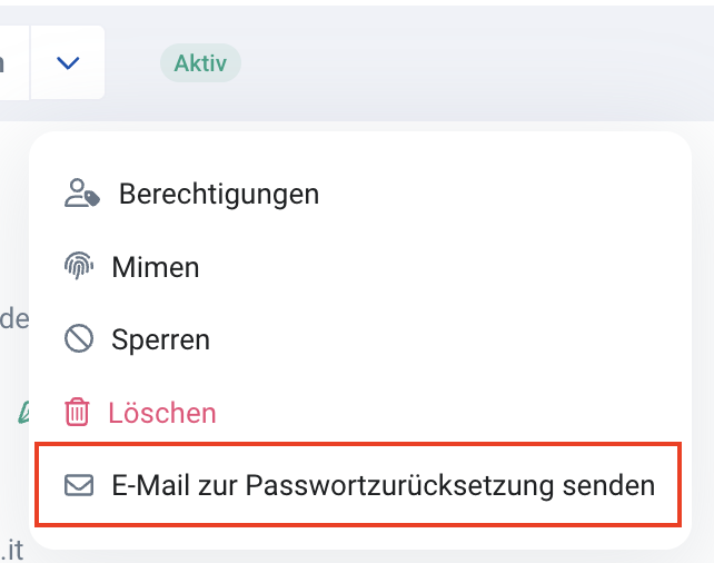 Wenn die Passwortzurücksetzung aufgrund zu vieler fehlgeschlagener Versuche automatisch blockiert wurde, kannst du über die Teilnehmerliste in der Plattformverwaltung eine E-Mail zur Passwortzurücksetzung senden. Dieser Vorgang behebt auch gleichzeitig die Blockierung der Passwortzurücksetzung.
