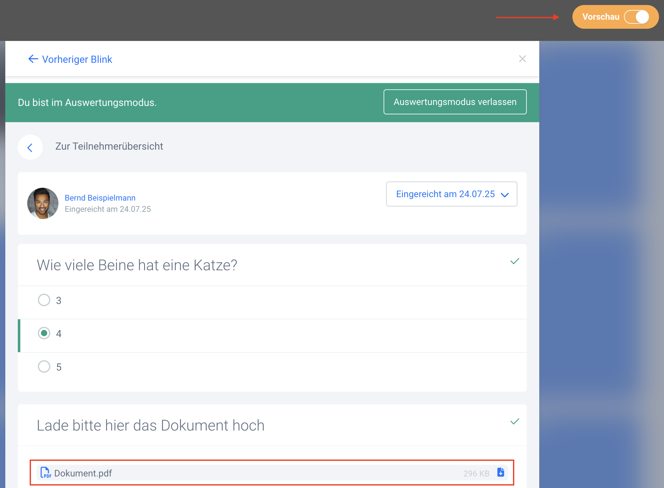 Um von den Teilnehmern hochgeladene Dateien abzurufen, musst du zusätzlich oben rechts die Vorschau aktivieren: