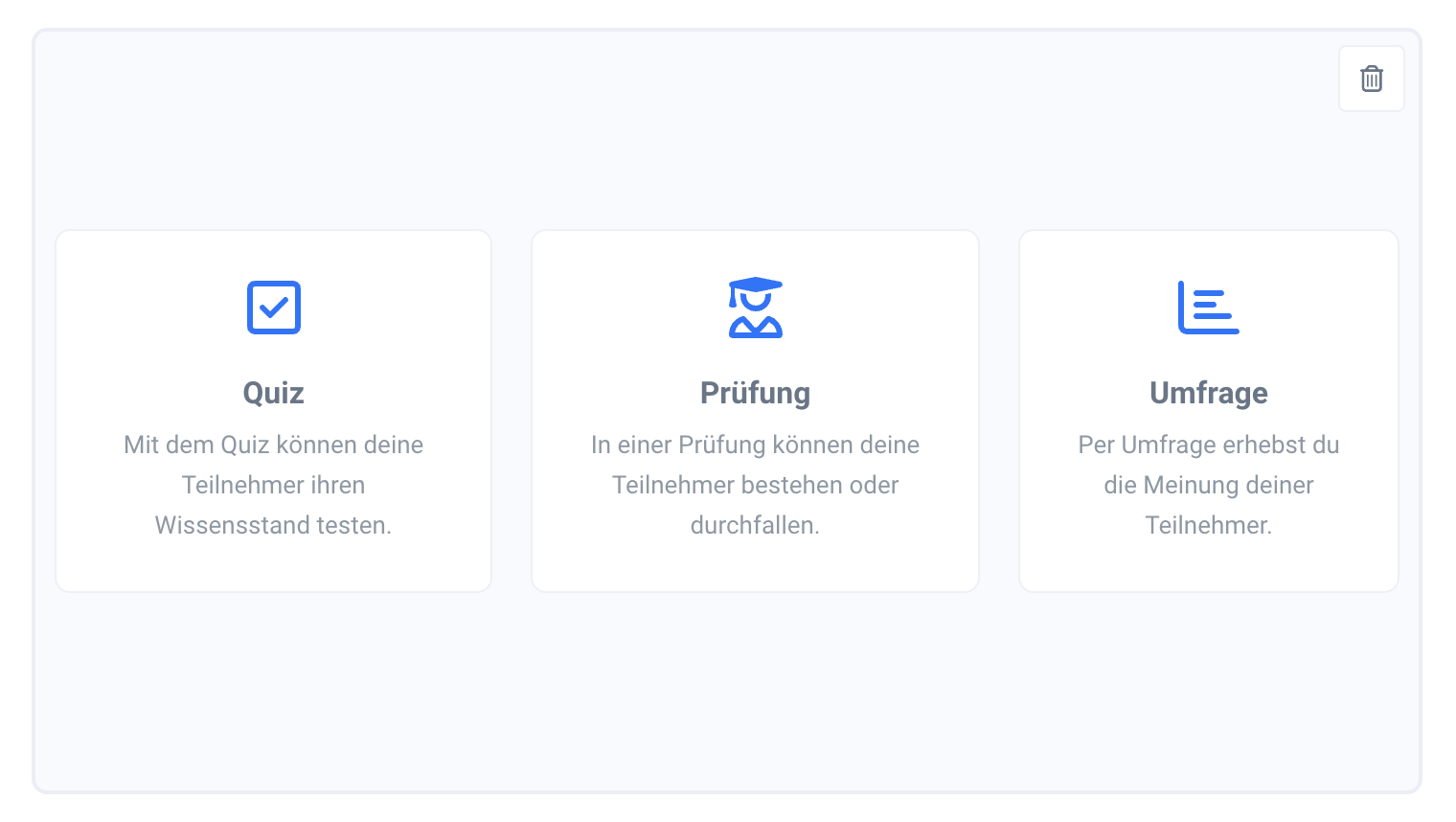 Quiz: Ein Quiz eignet sich gut, wenn du deinen Teilnehmern einen Selbsttest zur Verfügung stellen möchtest. Die Teilnehmer prüfen selbstständig ihr Wissen. Der Teilnehmer bekommt Auskunft, welche Frage er beantworten konnte. Falsch beantwortete Fragen sind mit Hinweistexten ausgestattet. Sonst hat das Quiz keine Konsequenzen. Der Teilnehmer kann in der Regel das Quiz so oft wiederholen, wie er möchte.
