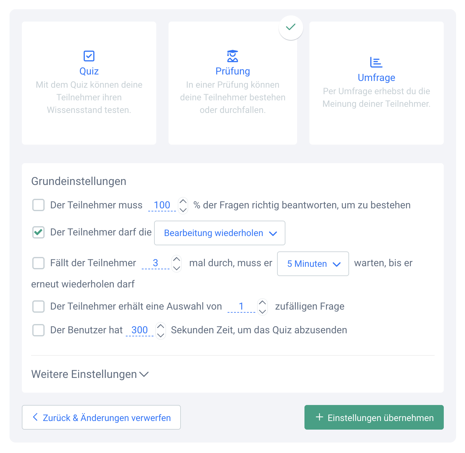 Prüfung: Anders als das Quiz hat eine Prüfung direkte Konsequenzen und Einschränkungen. Die Beantwortung der Fragen in der Prüfung entscheidet darüber, ob der Teilnehmer z.B. den Kurs fortsetzen darf oder ein Zertifikat ausgestellt bekommt. In einer Prüfung können die Zeitdauer, die Anzahl der Versuche und eine zufällige Auswahl an Fragen festgelegt werden.