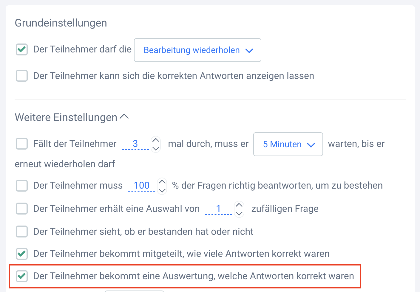 "Der Teilnehmer bekommt eine Auswertung, welche Antworten korrekt waren" -Interaktionseinstellung